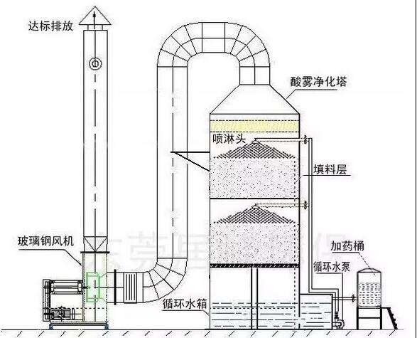 酸雾处理塔的工艺与产品综合国内外同类净化塔的优点,结构简单、能耗低、净化效率高和适用范围广的特点,能有效去除氯化氢气体(HCl)、氟化氢气体(HF)、氨气(NH3)、硫酸雾(H2SO4)、铬酸雾(CrO3)、气体(HCN)、碱蒸 (NaOH)、硫化氢气体(H2S)、福尔马林(HCHO)等水溶性酸、碱气体。
